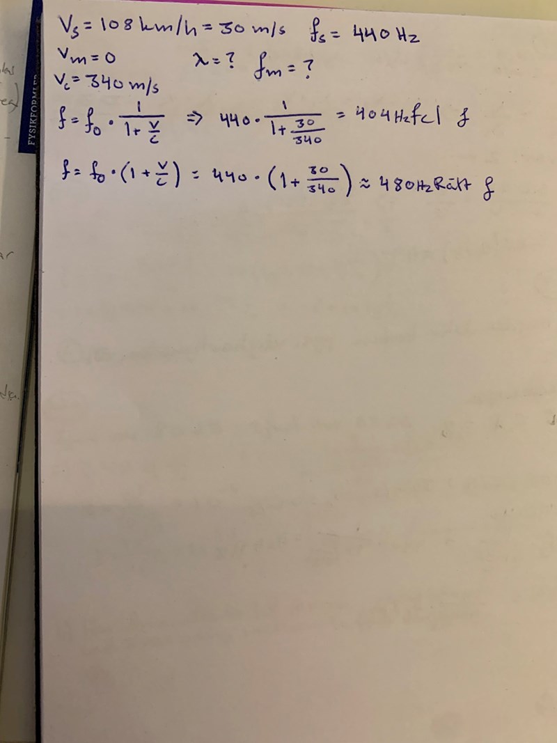 Du har troligvis skrivit in fel på räknaren. Om man skriver 440*(1/(1+v/c)) får man 404Hz, men skriver man 440* (1/1+(v/c)) får man 478,8 = 480 Hz.