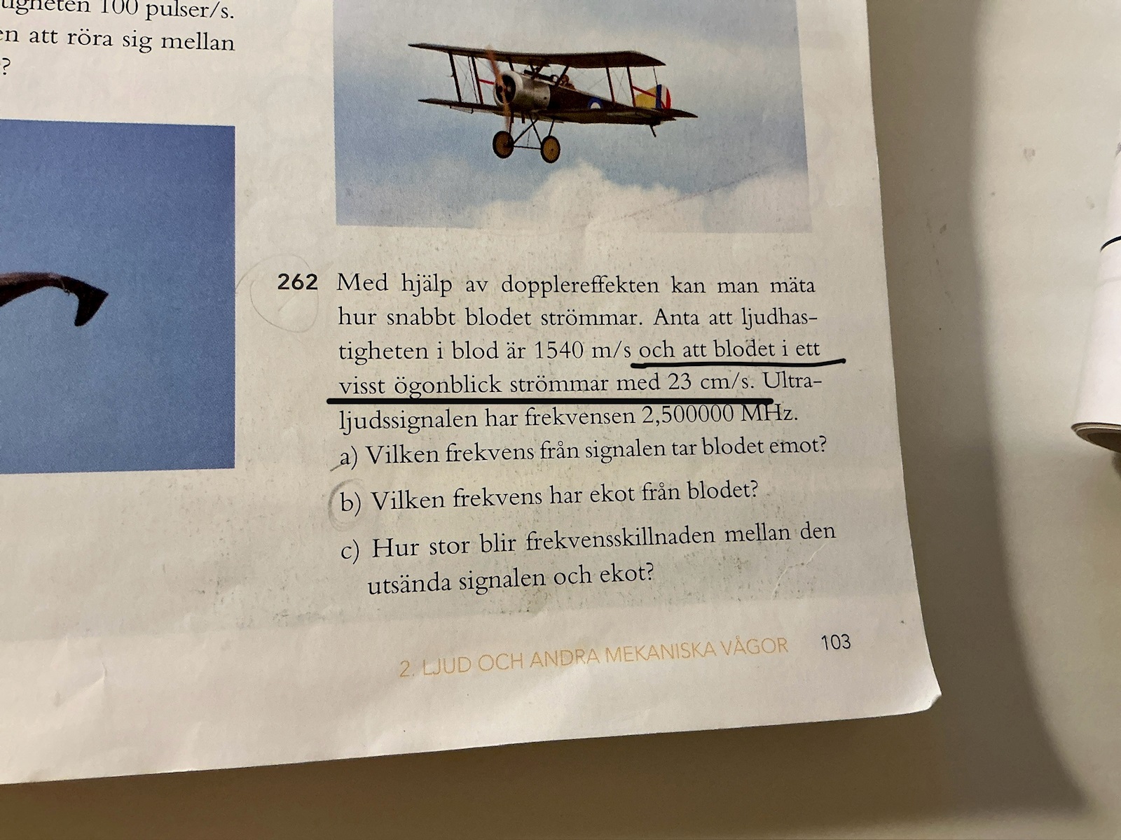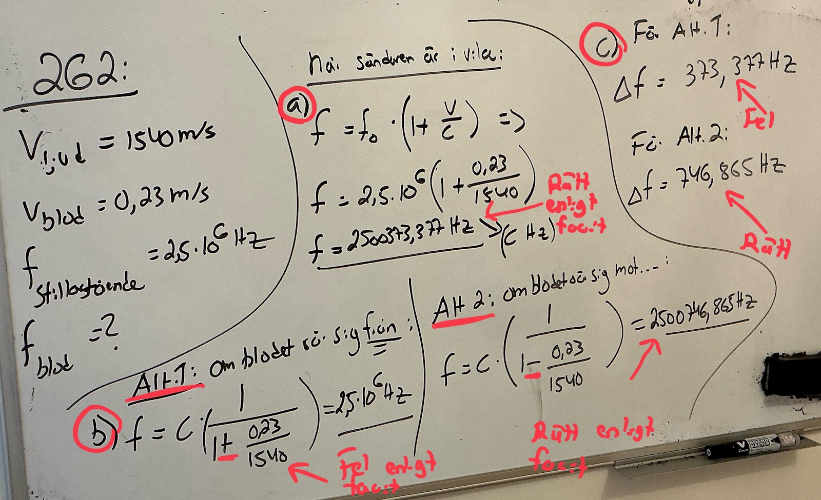 N har jag beräknat b - uppgiften beroende på om blodet rör sig ifrån respektive mot den stillastående källan. Svaret i b - uppgiften påverkar svaret i c - uppgiften. Jag har markerat vad som är rätt respektive fel enligt facit (dvs. a, alt 2 b och alt 2 c är rätt enligt facit). Men det andra sättet är alltså minst lika rätt eftersom uppgiften inte är tydligt formulerad?