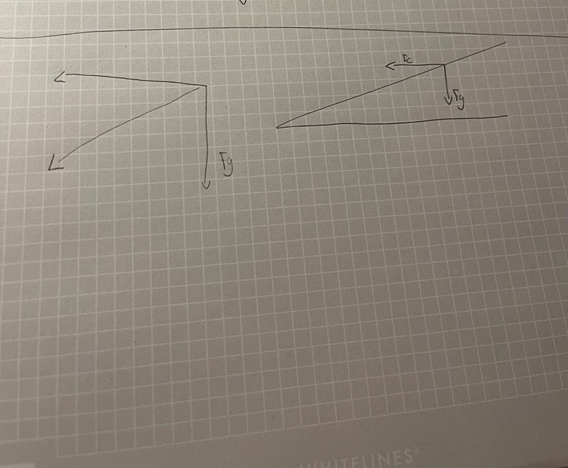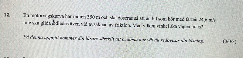 Bilen kommer ha en kraft nedåt (tyngdkraften) och en kraft riktad utåt till följd av cirkelrörelsen. Rita upp resultanten av dessa krafter. Bilen kommer inte glida ut från vägbanan om kraftresultanten är vinkelrät mot vägen.