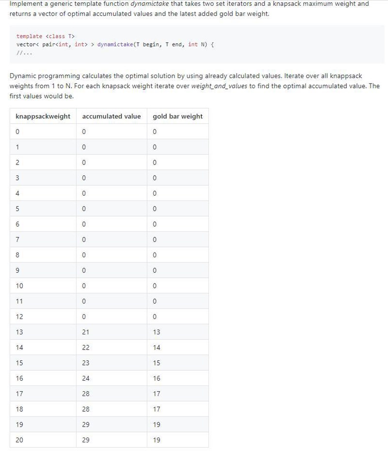 Jag har sett många DP knapsack lösningsexempel, men alla knapsacklösningar använder en matris för att lösa problemet. Denna funktion returnerar istället en vektor med int-par som element. Hur ska man tänka här? Hur börjar man skriva en DP knapsacklösning utan att använda en matris (det står ingenstans explicit att man inte kan använda en matris, men med tanke på att returtypen är en vektor så tror jag att det är det dem antyder)? Jag tänker att indexet av vektorn är menat att vara knapsackvikten och int-värdena i elementparet är menade att vara "acc value" och "gold weight". Är jag på rätt spår? Om detta är fallet så låter det också lite ologiskt. Med en matris så har jag två indexpekare (i och j) och ett elementvärde. Här har jag då en indexpekare (knapsackvikten) och två elementvärden (i form av ett int-par). Är det ens möjligt att lösa det på det sättet?
