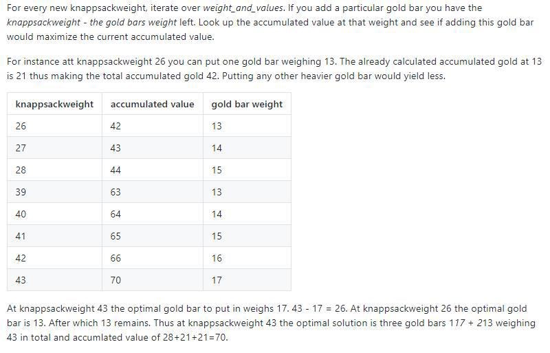 Yes, det förstår jag också. Problemet är att "gold bar weight" inte är givet som det är i tabellen. När jag kommer till knapsackvikt 43 så vet jag inte vad "gold bar weight" ska ha för värde. Hur vet dem att den optimala gold bar vikten vid knapsackvikt 43 är just 17 och inte något annat tal? Hur får dem fram det? Dem säger att 17 är det optimala värdet vid knapsackvikt 43 som om det våre en självklarhet, men jag har ingen aning hur dem fick fram siffran 17.