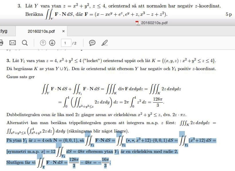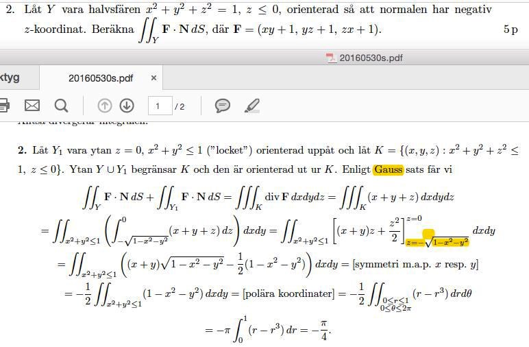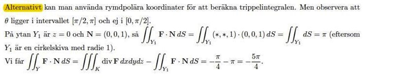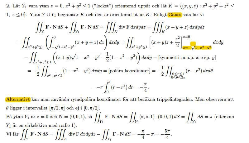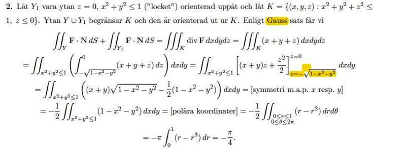 Ser inte alls det konstiga i frågan, han är ju jättetydlig? (Om inte jag fattar helfel nu). För att använda gauss sats vill man ha en stängd figur. Både halvsfären och paraboloiden? (Får det inte till en cylinder?) behöver läggas till ett ”lock” för att få det, som de kallar för Y1 i de här uppgifterna. Flödet genom locket borde ju dras bort från flödet genom hela för att få genom önskad bit av figuren. Men det verkar missas i en av lösningarna.