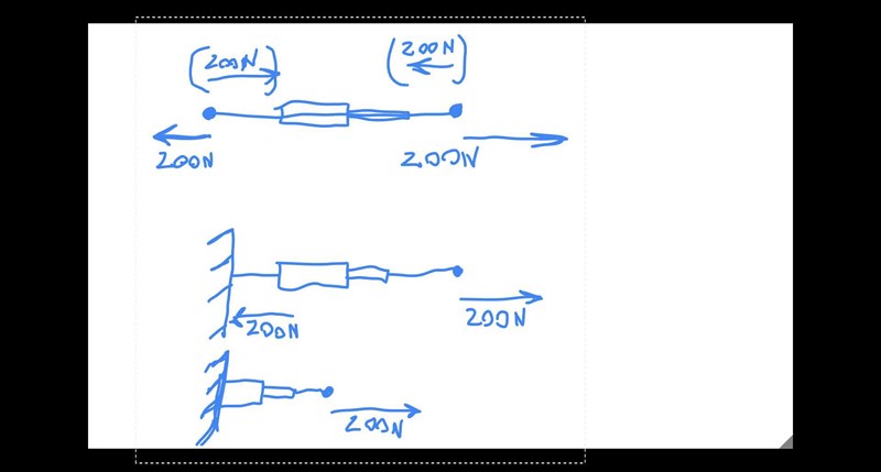Men jag vill gärna få en bättre redovisning än den jag tänkt ut. Då man skulle på ett annat sätt kan tänka sig att dynamometern visar 400 N eftersom den dras ut med 200 N åt bägge hållen och fjädern bli längre.