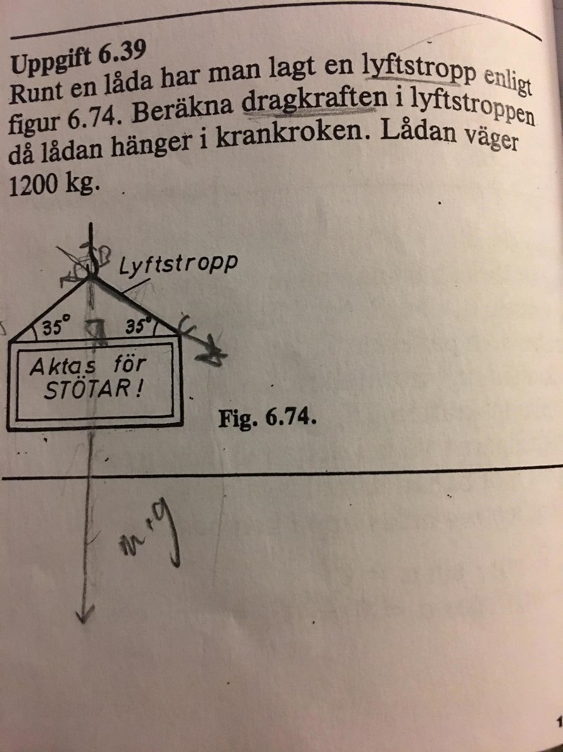 F= 20523/2, med tanke på att det finns två lyftstropp. Vilket motsvarar 10261 Newton (10.261 kN). Enligt facit är svaret 10.3 kN.