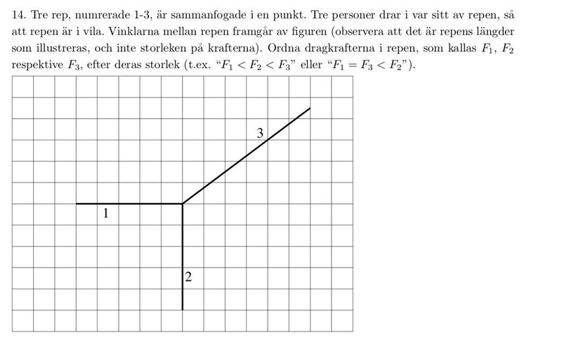 Men jag vet inte hur jag ska lösa uppgiften. Jag tänkte först att man kunde använda sig av vinklarna eller av längderna på repen. Rep 1 och 2 är lika långa enligt figuren så det mest logiska jag kan komma på är att vinklarna borde avgöra kraftens storlek. Längre än så kommer jag inte, uppskattar alla tips!