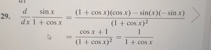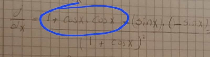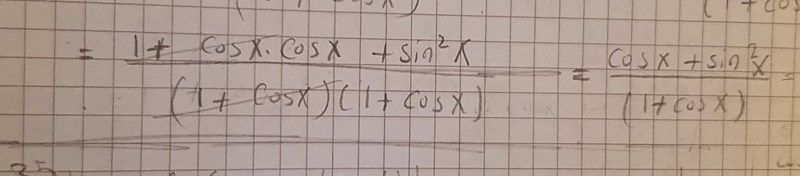 Är du med på att täljaren är (1+cos(x))•cos(x)+sin2(x) och inte 1+cos(x)•cos(x)+sin2(x) som du har skrivit?