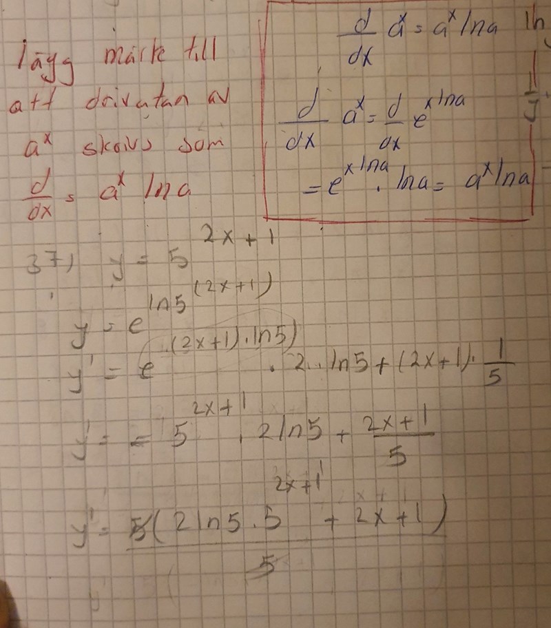 Tack nu ser jag vad var min misstag. Jag trodde att för x ln5 i man ska använda produktregeln men det var egentligen och inte en produkt.