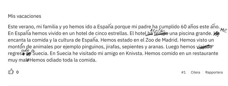 Este verano, mi familia y yo hemos ido a Espana porque mi padre ha cumplido 60 anos este ano. En Espana hemos vivido en un hotel de cinco estrellas. El hotel ha tenido una piscina grande. He encanta la comida y la cultura de Espana. Hemos estado en el Zoo de Madrid. Hemos visto un monton de animales por ejemplo pinguinos, jirafas, sepientes y aranas. Luego hemos viajado regresa de Suecia. En Suecia he visitado mi amigo en Knivsta. Hemos comido en un restaurante muy mal. Hemos odiado toda la comida.