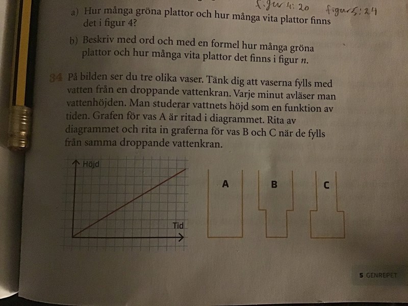 Den blå linjen är rätt till en början, efter den punkt den bryter av (där vas B får samma diameter som i fall A) ska den blå linjen vara parallell med blyertslinjen. Den ska inte korsa blyertslinjen.