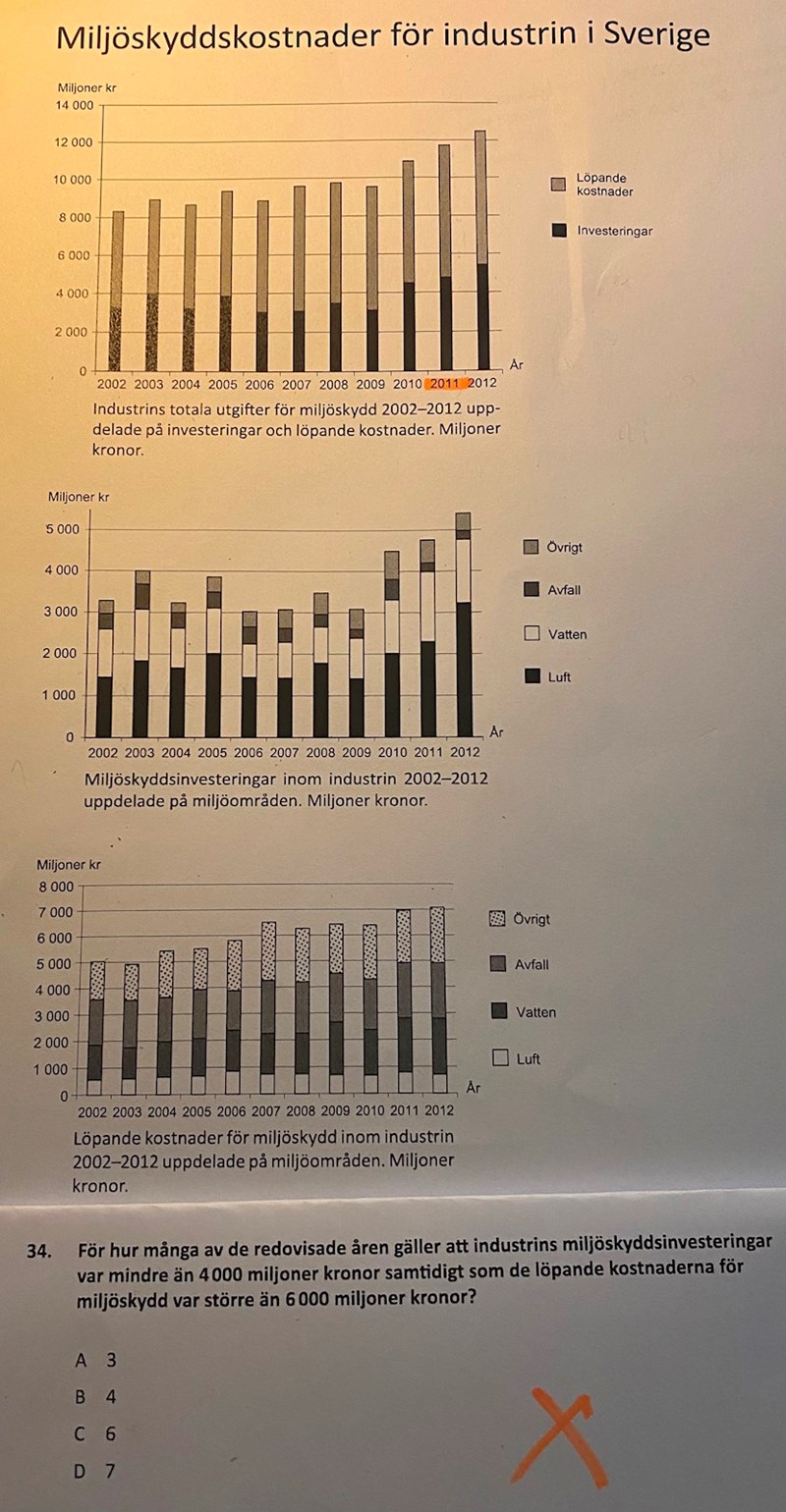 Smutstvätt skrev:Dra linjer! Det hjälper nästan alltid. :) Dra en linje vid miljoner i diagrammet över investeringar, och en linje. vid miljoner i diagrammet över löpande kostnader. Hur många staplar ligger under linjen i det övre diagrammet? Hur många av dessa år ligger över linjen i det undre diagrammet? :)