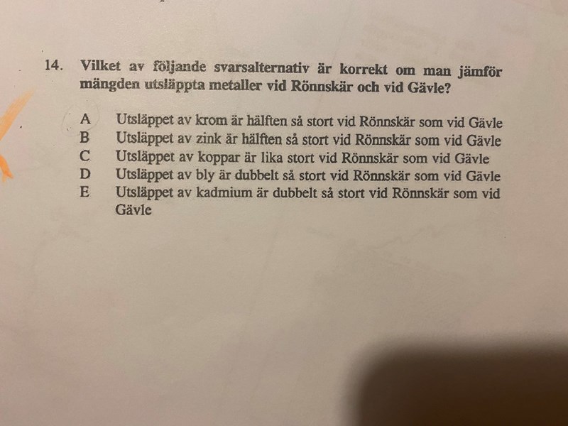 Hej! Jag har en fråga angående denna uppgift, hur kan man effektivast räkna ut de olika påståendena? Jag tycker för det första det är svårt att uppskatta vilken procent varje stapel har då det inte står angivet. Sen ska man väl beräkna andelen av totalen (ton/år) för varje metall, som dessutom skiljer sig åt mellan de olika diagrammen (Rönnskär och Gävle) t.ex: i Rönnskär är ton/år för Pb 78 medan i Gävle är ton/år 170? Det tar ju väldigt lång tid att göra detta på alla påståenden (A-E), hur hade ni gjort?