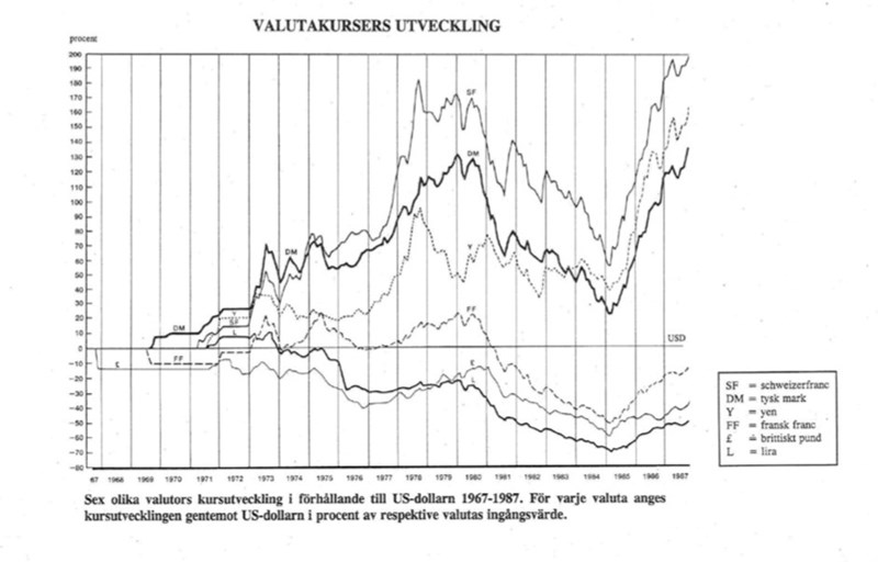 Laguna skrev:Det står inte vad valutorna faktiskt kostade i USD, utan det står ett relativt tal. Om man läser av t.ex. 40% för DM någonstans så betyder det att det kostade 40% mer USD att köpa DM då än det gjorde när kurvan för DM startade, dvs. i slutet av 1969.