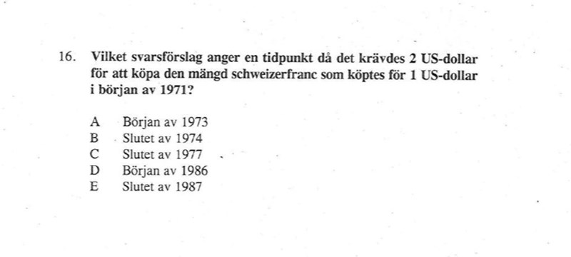 Jag har fastnat på denna uppgiften och förstår verkligen inte hur jag ska räkna? För det första hur kan jag läsa av hur många USD x SF (schweizerfranc) kostar i diagrammet? Förstår inte riktigt vad diagrammet visar, det står att den visar kursutvecklingen för varje valuta gentemot US-dollarn i procent av respektive valutas ingångsvärde. Men förstår ändå inte riktigt hur jag ska se när x motsvarar 2 USD?