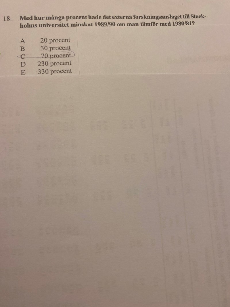 I detta fallet fick jag kvoten 4384/6253 och då kan jag ju direkt stryka alternativ A och B eftersom jag ser att täljaren är större än ”hälften av nämnaren” dvs procenten måste vara större än 50%. Sedan kan jag även stryka alternativ D och E eftersom jag ser att täljaren är mindre än nämnaren och därför är 70 dvs alternativ C mest rimligt!