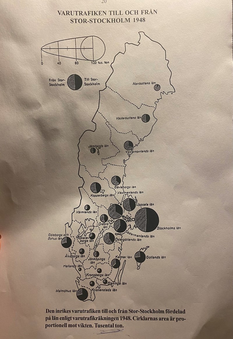 Jag försökte att läsa mig till i beskrivningen under kartan hur den ska begagnas men blev inte klokare. Exempelvis I fråga 19. Där man ska besvara ”hur många ton som varutrafiken från Västmanlands län till Stor-Stockholm omfattade?”, så visste jag inte för det första vilken diameter eller om det är radie(?) jag skulle mäta. Jag tänkte eftersom det stod ”från” Västmanlands län så skulle jag mäta det randiga områdets radie eller diameter för den cirkeln som står för Västmanlands län. Sedan förstår jag inte hur jag ska bestämma antalet ton mha ”omvandlaren” uppe i vänstra hörnet, ska jag mäta vertikalt eller horisontalt, och från vilken mittpunkt ska jag utgå ifrån? Blir väldigt osäker på nästan allt. Sedan förstår jag inte heller vad jag ska göra med ”Stor-Stockholms” cirkel? Ska jag mäta i den också på något sätt?