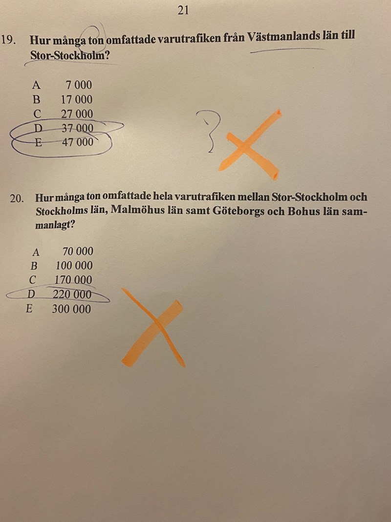 I fråga 20 så räknade jag bara det totala antalet ton från 3 län, Malmöhus län+Göteborg&Bohus län+ Stockholms län= 30•103+30•103+105•103= 165•103 ton. Och svaret ska bli C. Var detta rätt då? Tack för din tid och hjälp!