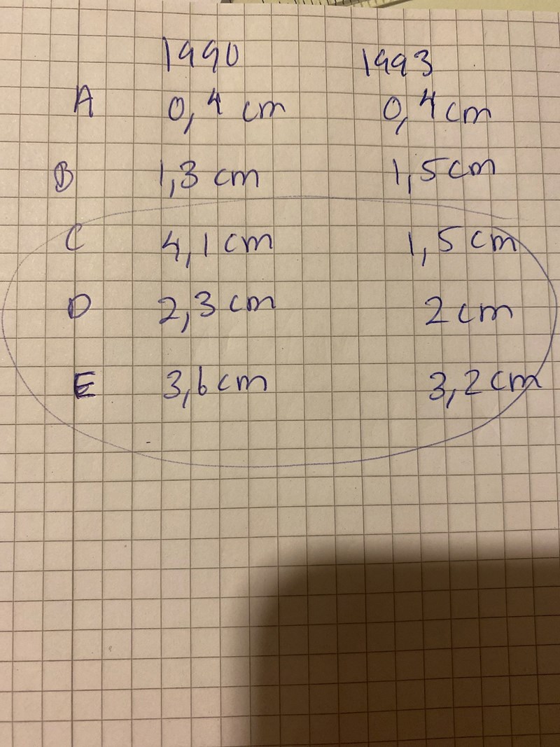 Har mätt nu men får fortfarande att C,D,E kan vara potentiellt korrekta svar, de har alla tre en kortare svart stapel i högra diagrammet än i vänstra? Här är måtten på staplarna för år 1990 och 1993, som jag mätt med linjal för varje alternativ:
