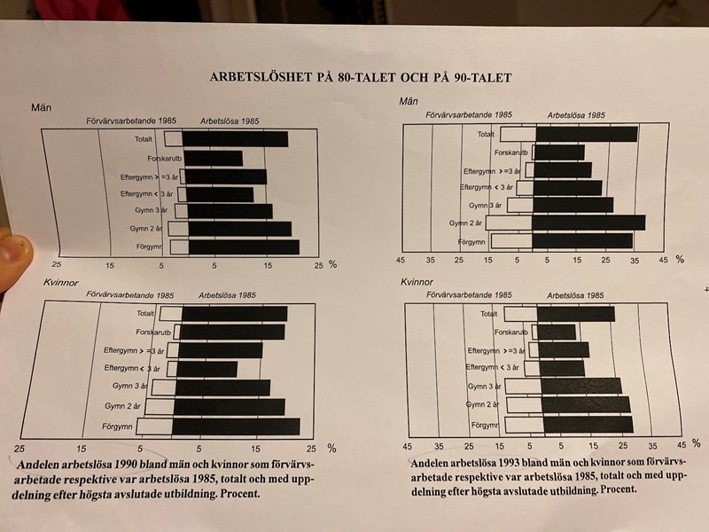 Okej tack! Förstår nu att jag ska jämföra staplarnas längd mellan det nedersta vänstra diagrammet och det nedersta högra diagrammet. Förstår dock inte nu vad frågan efterfrågar? Vill de inte att jag ska utse den grupp där antalet arbetslösa MINSKAT år 1993 i jämförelse till år 1990? Borde jag inte därför leta efter en grupp vars stapel i det nedersta högra diagrammet är KORTARE än stapeln i det nedre vänstra diagrammet? ( Alltså pga arbetslösheten har minskat) Det är detta jag inte förstår:(