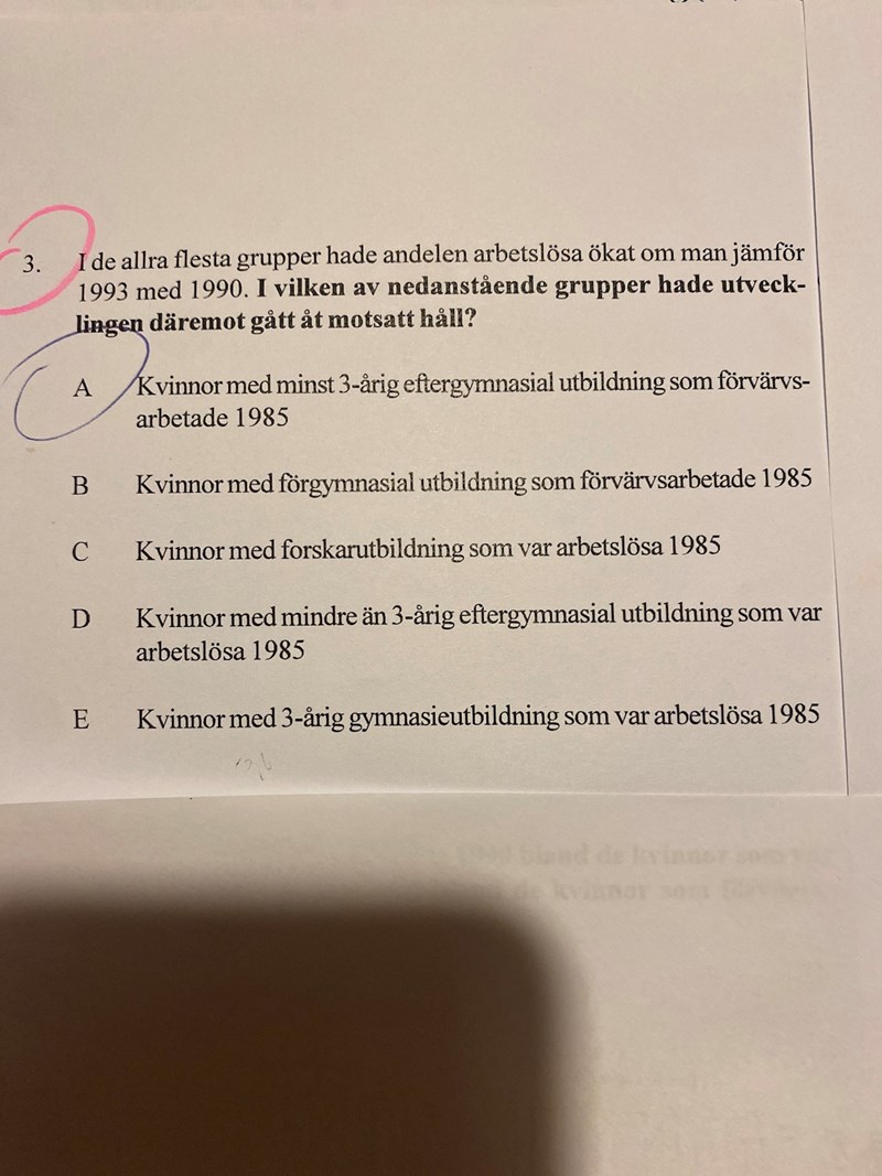 Jag blir väldigt förvirrad av frågan. Vet inte riktigt var och vad jag ska söka. Min tolkning av diagrammen är att den vänstra spalten är data info från år 1990 och på högra spalten från år 1993. Men sen tycker jag det blir så konstigt för när man läser i diagrammen så stå det att det är data info från 1985 på alla, dvs ”förvärvsarbetande 1985” och ”arbetslösa 1985”, jag förstår inte hur det går ihop? Min tolkning av frågan är att jag ska hitta den grupp (som endast utgörs av kvinnor dvs nedersta raden) där andelen arbetslösa ISTÄLLET minskat från år 1990 till år 1993? Min taktik var då att uppsöka de olika grupperna som alternativen (A-E) presenterar, det var här sedan det blev så krångligt för mig att avgöra för vilken grupp som arbetslösheten minskat år 1993. Förstod liksom ej hur jag skulle avläsa diagrammet… Det finns en stapel som benämns ”Totalt”, är det totala antalet kvinnor i det enskilda diagrammet, alltså summan av totala antalet förvärvsarbetande och totala antalet arbetslösa? Jag vet ju inte ens hur stort denna ”totalen” är, hur ska jag då kunna avgöra hur många arbetslösa respektive grupp utgör? Hur ska jag gå vidare härifrån?