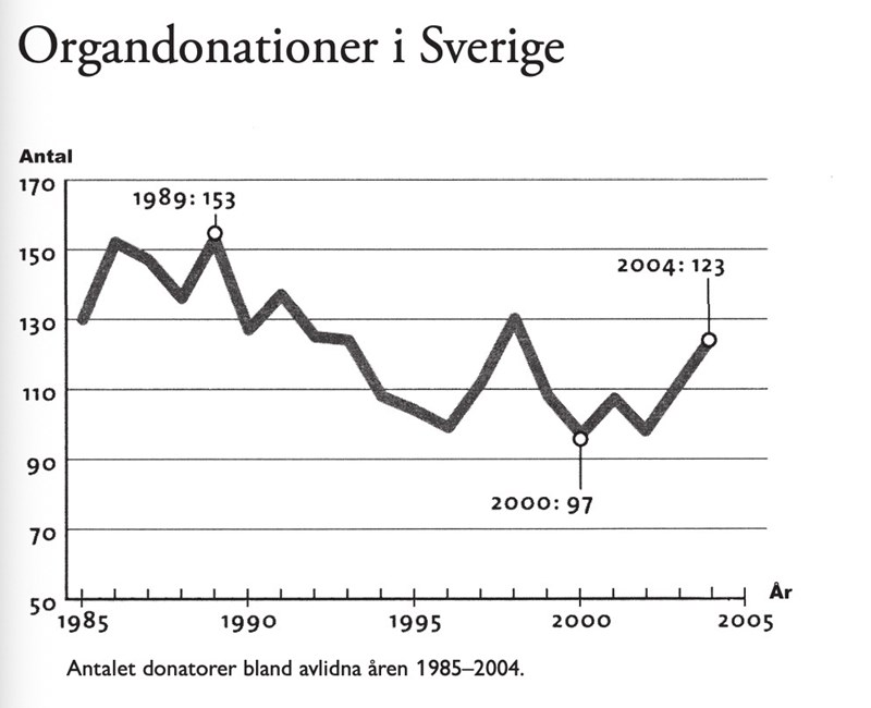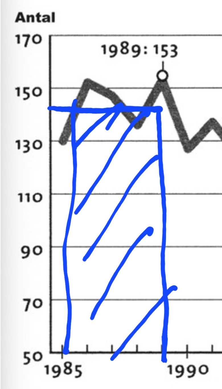 Tar det inte längre tid att räkna ut arean då i så fall? Tänker att man ska multiplicera längden med bredden för att få ut arean, det vill säga antalet donatorer bland avlidna multiplicerat med årtalet?