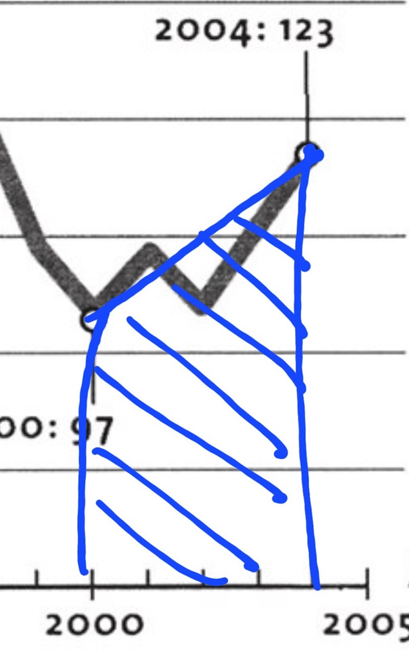 (Jag inser nu att jag tidigare ritat de blåa områdena över 4 år istället för 5 år, därav det låga värdet jag fick i mitt första svar.)