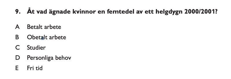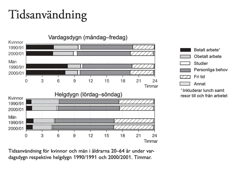 Vi kan se att det som kvinnorna ägnade en femtedel av ett heldygn åt år 2000/2001 var 50/50 mellan fri tid och obetalt arbete.