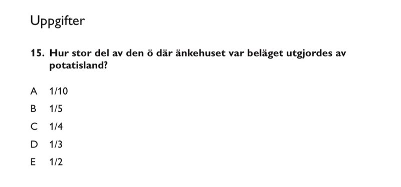 Hur ska man smidigt lösa den här uppgiften? Ska man stapla upp potatisländerna på varandra och sedan räkna hur många gånger det får plats i ön med en linjal, och dividera dess area (sett till ytan) med totala arean av ön? Dvs räcker det att lösa uppgiften med hjälp av ögonmått och uteslutningsmetoden?