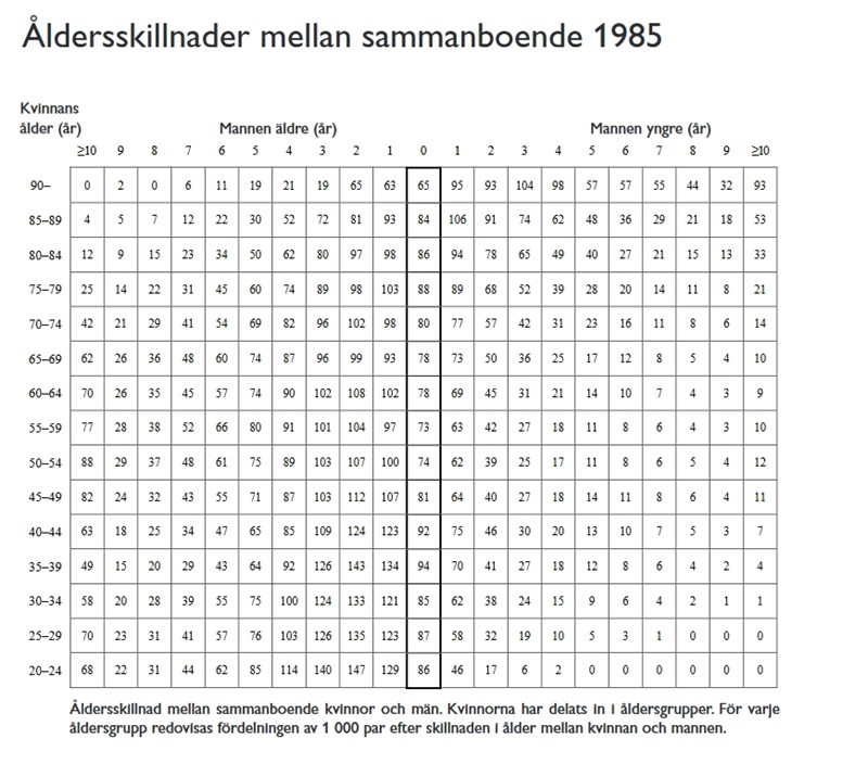 åldersgrupp redovisas fördelningen av 1 000 par efter skillnaden i ålder mellan kvinnan och mannen.”