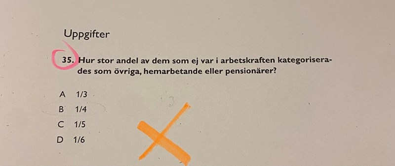 Hilda skrev:Jag skulle också titta i grafen och göra en uppskattning av hur stor andelen blir om man plussar ihop grupperna. Jag kommer också fram till 1/4.