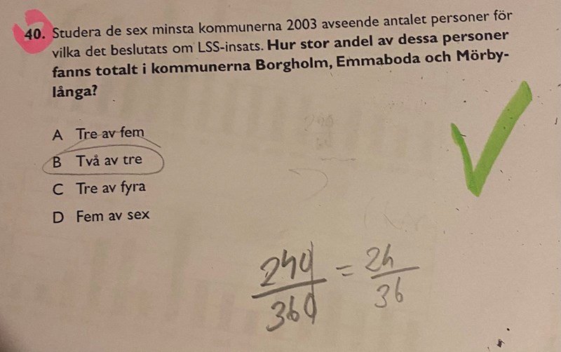 Hej! Jag undrar hur jag ska enklast ska räkna i denna uppgiften? Jag beräknade delen till 240 och sen totalen till 360 och tog 240/360=24/36 och därefter ska jag få denna kvot att överensstämma med något utav svarsalternativen men tycker det är svårt att se med blotta ögat vilket som är rätt så chansade lyckligtvis på B, vilket var rätt svar. Men jag undrar om det finns ett annat sätt att beräkna andelen än att läsa av exakta värdet i y-axeln, känns väldigt svårt att göra under tidspress och få värdena att stämma. Hur hade ni gjort?