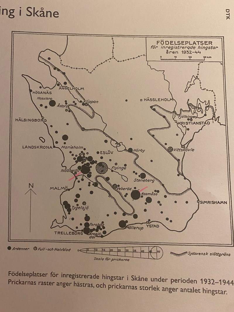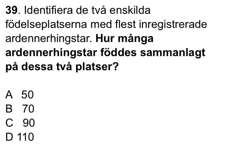 Hej! Jag blir lite fundersam till denna frågan. Jag kom fram till att det var dessa två enskilda födelseplatser som det var tal om i frågan (de svarta cirklarna med rosa sträck) eftersom de var störst till storleken. Men sen när jag mha skalan, under kartan, beräknar summan av antalet födda ardennerhästar på dessa två platser så får jag summan till 13. Jag mätte de båda cirklarna och insåg att de var lika stora, 0,5 cm vardera. Sedan mätte jag detta på skalan under kartan och såg att 0,5 cm motsvarar ca. 6,5 st och då blir summan 6,5+6,5=13 st. Men det finns ju inte ens något svar som säger 13, utan det närmaste är 50…