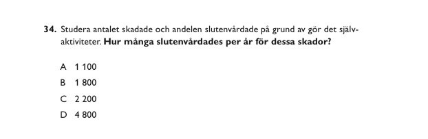 Jag fick det totala antalet skadade pga ”göra det själv aktiviteter” till 2300+4000=27000 och sen fick jag andelen som ”slutenvårdades” till 18 % av 27000= 4800 ungefär och det är inte rätt svar. Vad gör jag för fel?