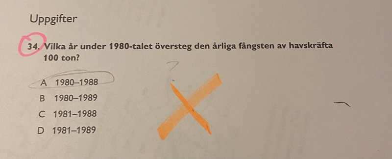 Hej! Jag förstår inte hur man ska tänka här? Jag tolkar det som att det är från år 1980-1988 (A) eftersom den specifika tidpunkten för när fångsten av havskräftor översteg 100 ton inföll ju mitt under året 1980 och därför bör man väl räkna från och med 1980. Samma sak med slutåret, tidpunkten för när fångsten av havskräfta understeg 100 ton inföll ju precis under år 1988 och inte på 1989. Om det är någon som förstår mig?