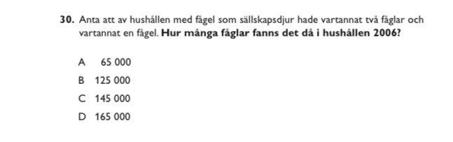 Jag uppskattade värdet, på de hushåll som ägde fåglar år 2006, till ca 82 000 hushåll. Därefter antog jag att hälften av dessa hushåll dvs 41 000 ägde 1 fågel och andra hälften dvs 41 000 ägde 2 fåglar. Sedan beräknade jag totala antalet fåglar =2•41 000+41 000= 82 000+ 41 000= 123 000 fåglar. Men det är tydligen inte rätt.