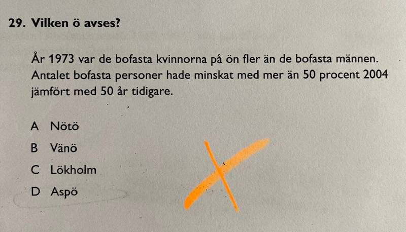 Hej! Jag har fastnat på denna uppgift och tycker det är så konstigt att svaret är A och inte D. Det jag hänger upp mig på är ”antalet bofasta personer hade minskat med mer än 50 procent 2004 jämfört med 50 år tidigare”. Enligt mig är det självklart att det är Aspö eftersom de år 1954 hade 18 totalt bosatta och år 2004 hade det minskat med 50 procent till antalet 9 totalt bofasta. Hur ska jag tänka?