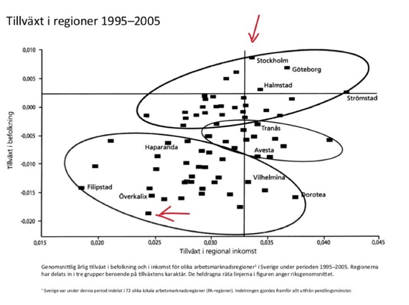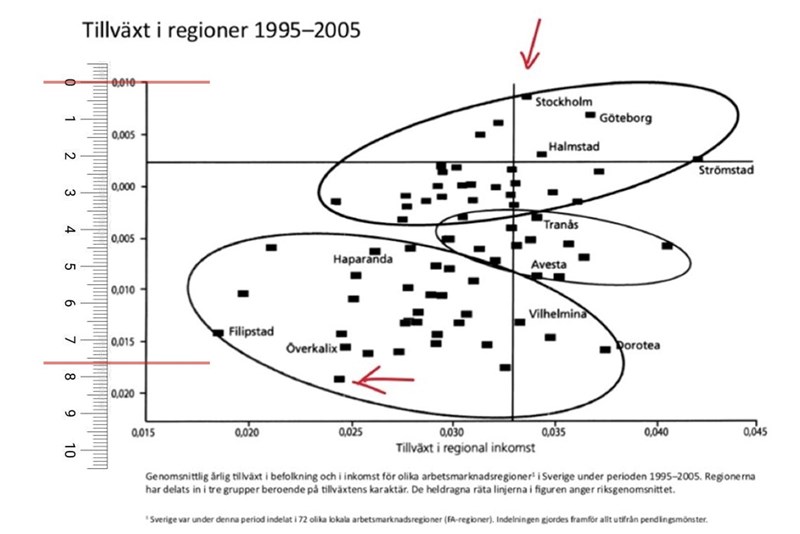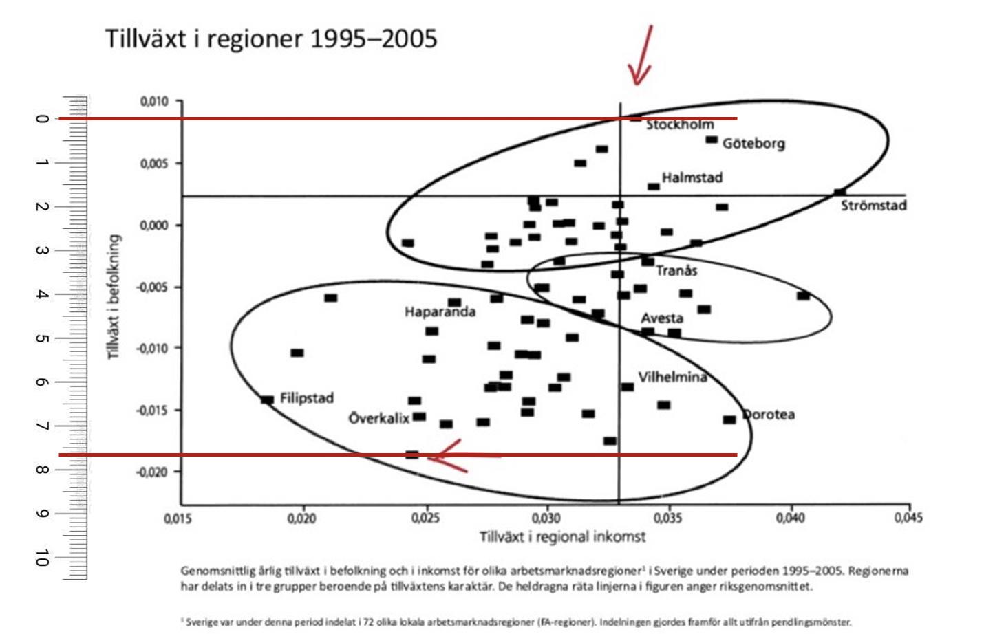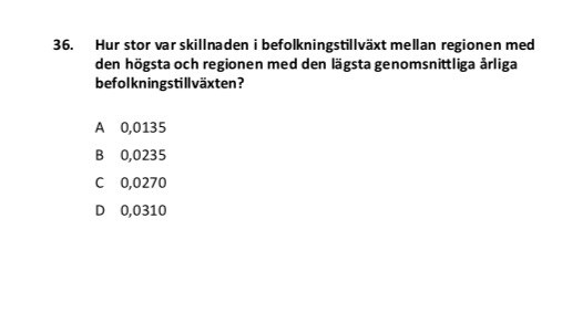 Hej! Jag tycker det är svårt att veta hur jag ska läsa av detta diagrammet. Jag vet inte om jag har valt ut rätt regioner men jag valde ut Stockholm som den med högst befolkningstillväxt och den regionen längst ner med röd pil som den lägsta. Sedan mätte jag ut 1 cm på y-axeln och kom fram till att det motsvarade 0,0025 och sedan mätte jag med utgång från 0-linjen till ca 3,1 cm till Stockholm och 6,7 cm till den lägsta regionen. Därefter multiplicerade jag Stockholm 3,1•0,0025=0,00775 och sedan lägsta regionen 6,7•-0,0025= -0,01675. Sedan tog jag Stockholms värde subtraherat med värdet för den lägsta regionen och fick värdet 0,0242, vilket inte stämmer? Ska bli 0,0270, alternativ C. Vad gör jag för fel och finns det ett enklare sätt att komma fram till svaret?