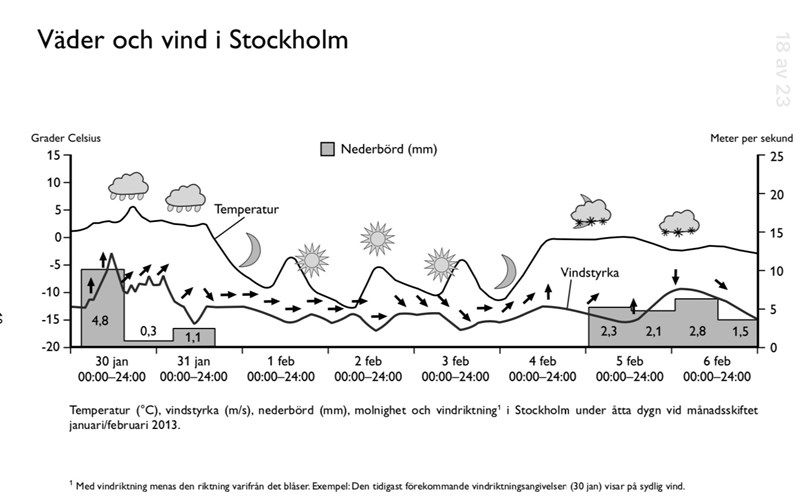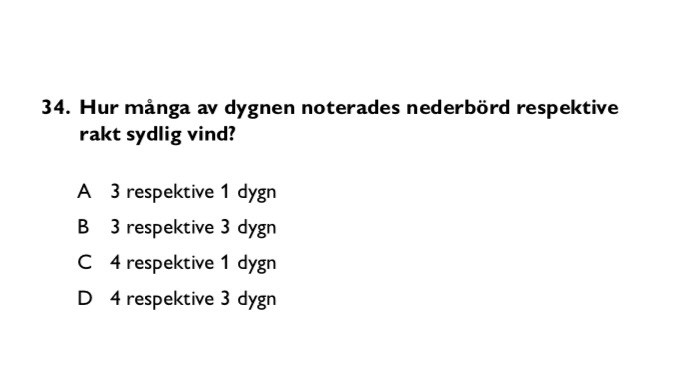 Hej, jag behöver hjälp med följande fråga. Rätt svar är D, och jag kan se de 4 dagarna med nederbörd men jag kan endast se en pil som visar på rakt sydlig vind vilket är den mellan 5 och 6 feb. Har jag missuppfattat frågan eller vilka fler dagar var det rakt sydlig vind?