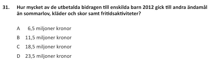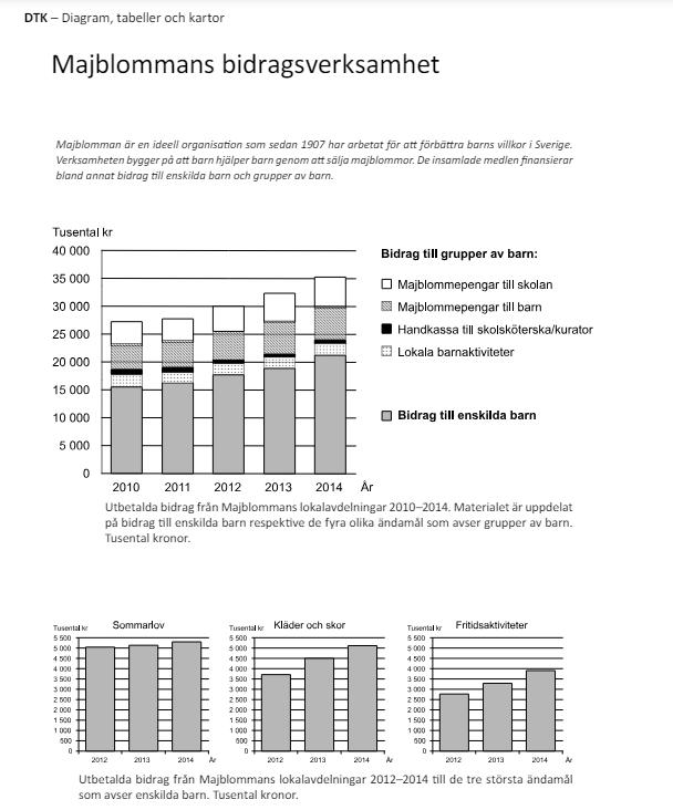 I vart och ett av de tre nedre diagrammen är siffrorna för 2012 staplarna längst till vänster. Jag avläser dem till derygt 5 miljoner, drygt 3,5 miljoner respektive drygt 2,5 miljoner. Adderar jag dessa får jag drygt 11 miljoner. Majblommepengar till barn år 2012 är ungefär 18 miljoner, så det som går till andra ändamål är ungefär 18-11 = 7 miljoner, och då är det bara ett alternativ som stämmer.