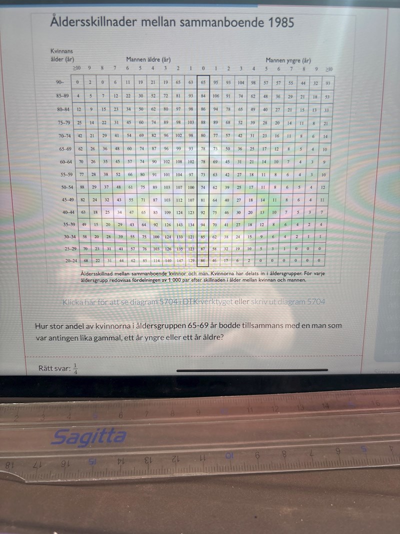 jag tittar på kolumnerna 1, 0, 1 vilket i frågan är dom män som frågas efter, dvs 1 år yngre, lika gammal eller 1 år äldre. I diagramtexten står det att varje åldersgrupp redovisas fördelningen av 1000 par, därav adderade jag ant män i kolumnerna jag nämnde ovan, och delade först med 3000 eftersom jag tänkte att varje kolumn står för andelen män i den specifika åldersgruppen av 1000 par. Men sedan insåg jag att frågan vill veta hur stor andel av kvinnorna som är i relation med dessa tre ålderskillnadena, och delade istället summan av män i dem tre kolumnerna med 1500, eftersom i paren består av en man och en kvinna och vi vill veta andelen kvinnor, så jag delade med det totala ant kvinnor med summan av män i dem tre efterfrågade kolumnerna. Jag får fram som slutsvar 6/35 vilket är långt ifrån svaret: 1/4
