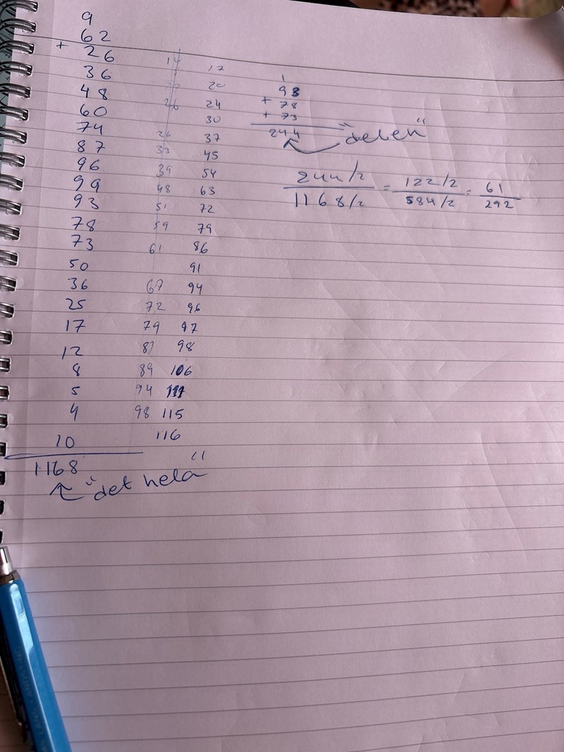 Jag vet att min lösning ser kaos ut men, som ni ser att jag har försökt addera och dela på enbart antalet kvinnor, alltså 1500, svaret är 25%, men jag får en jättestor nämnare i jmf med täljaren, blir inte jämnt…