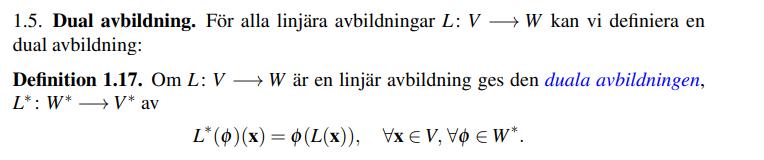 . Notera att om ligger i W* så ligger i V*. Sedan måste man väl visa att det faktiskt är en linjär avbildning.