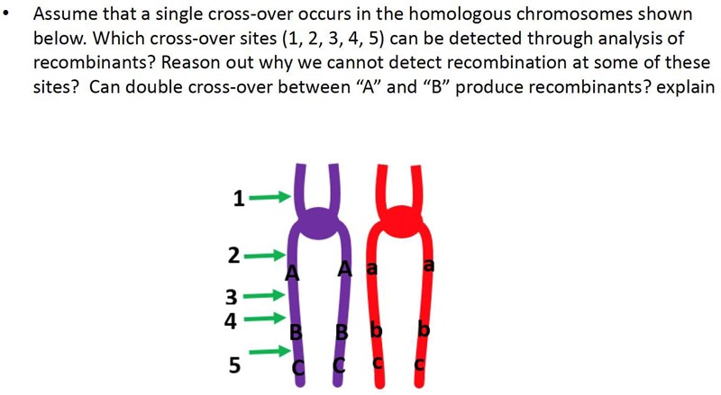 En dubbel överkorsning mellan A och B betyder ju först en vid site 3 och sedan en vid site 4 (eller omvänd ordning, men det spelar ingen roll). Den första överkorsningen (vid site 3) gör ju så att den lila kromosom blir röd från site 3 och nedåt (och tvärtom för den lila). Nästa överkorsning (vid site 4) flyttar ju tillbaka en röd bit, så den blir röd från 4 och ned. Man får alltså en lila kromosom med en röd bit mellan 3 och 4. Men där finns ju ingen av generna A, B och C, så vi kan inte detektera den biten.