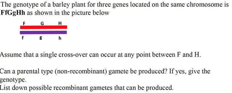 När det gäller de möjliga rekombinanta gameterna så måste du komma ihåg att det står "assume that a single cross-over can occur". Du får alltså klippa och klistra men bara en gång! Till exempel fGh som du skriver kräver två klipp. Fundera igen på vilka som kan bildas genom att du kapar på ett ställe.