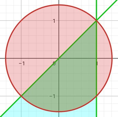 En cirkel med radie 2, och mittpunkt i origo som skärs av linjerna x=1 och y=x