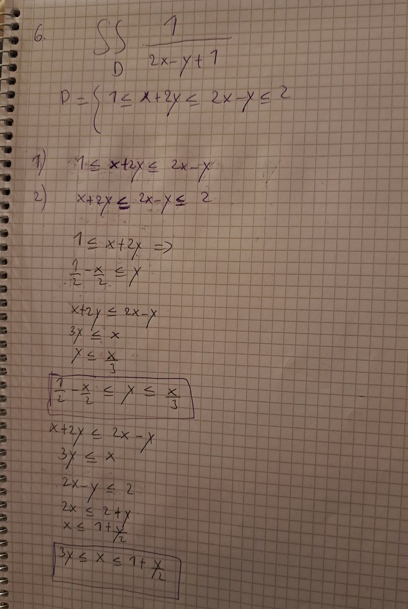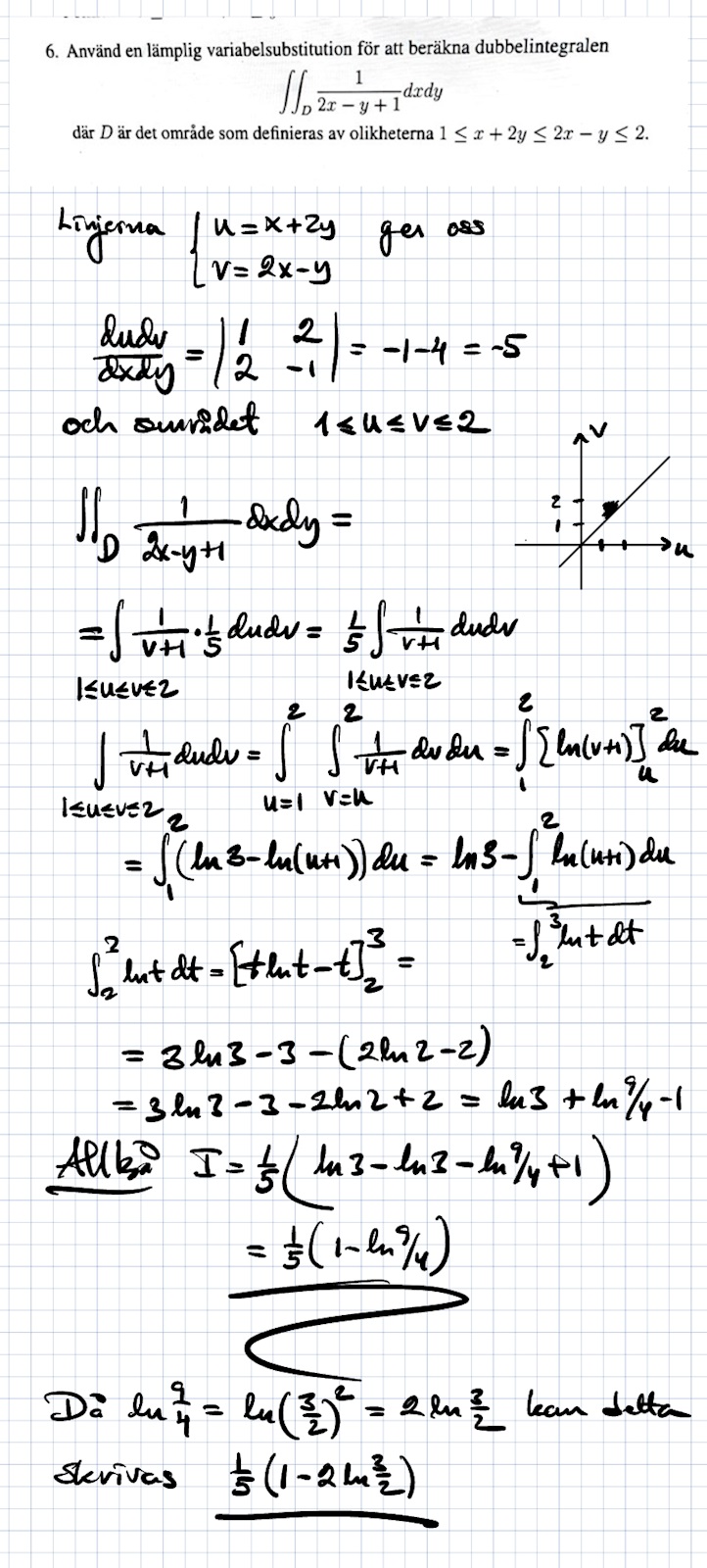 Trinity2 skrev:u=x+2y och då ger början av olikheten, om vi ersätter x+2y med u att 1≤u sedan kommer u≤2x-y, men 2x-y=v så vi har 1≤u≤v≤2.