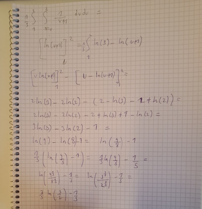 Ditt svar är inte rätt enligt facit. Det ska vara 1/5-2/5*ln(3/2). Jag förstår inte hur de kommer fram till det svaret. Såhär får jag