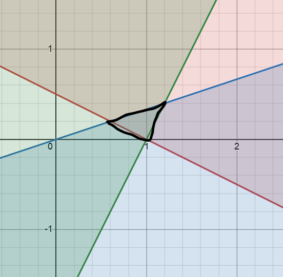 - , vilket är ekvivalent med , så det är halvplanet ovanför linjen (grönt i figuren nedan)
