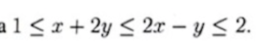 u=x+2y och då ger början av olikheten, om vi ersätter x+2y med u att 1≤u sedan kommer u≤2x-y, men 2x-y=v så vi har 1≤u≤v≤2.