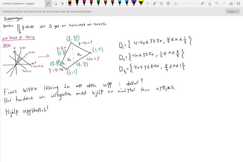 Jo det hade varit trevlig. Med de sneda linjerna, menar du då y=4x och y=5x? Förstår inte hur jag skulle kunna uttrycka dem med v(x,y) sådan att integrationsområdet blir en rektangel, har du något tips?:<