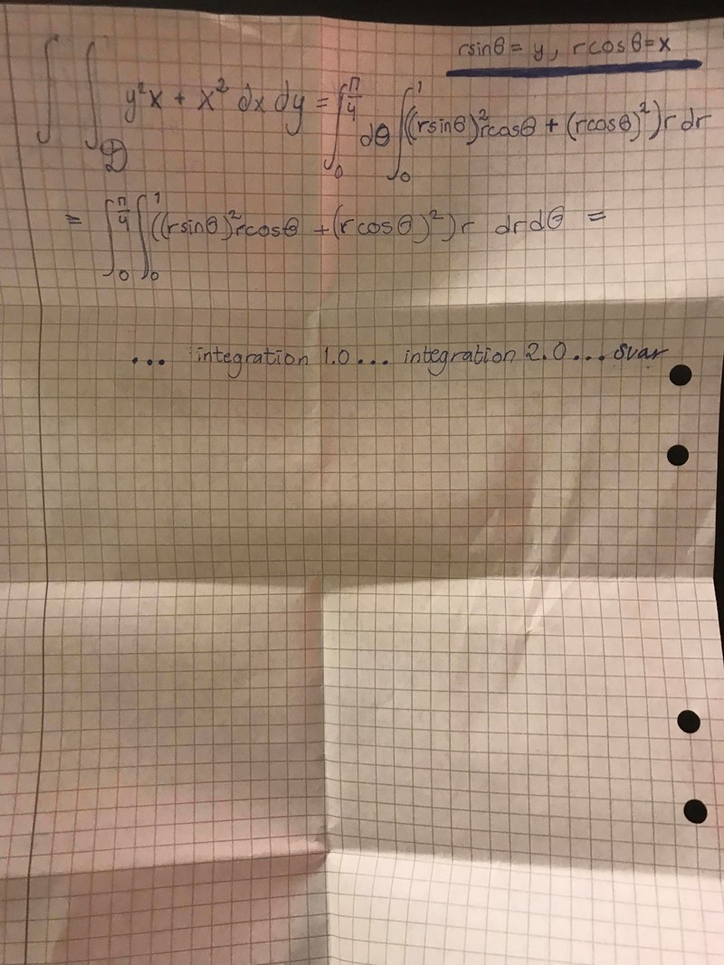 Finns inget facit, har jag tänkt rätt och hur integrerar jag sen det här uttrycket? Känns så långt. Jag vet hur man integrerar dubbelintegraler, vet bara inte hur jag ska integrera just denna integral...
